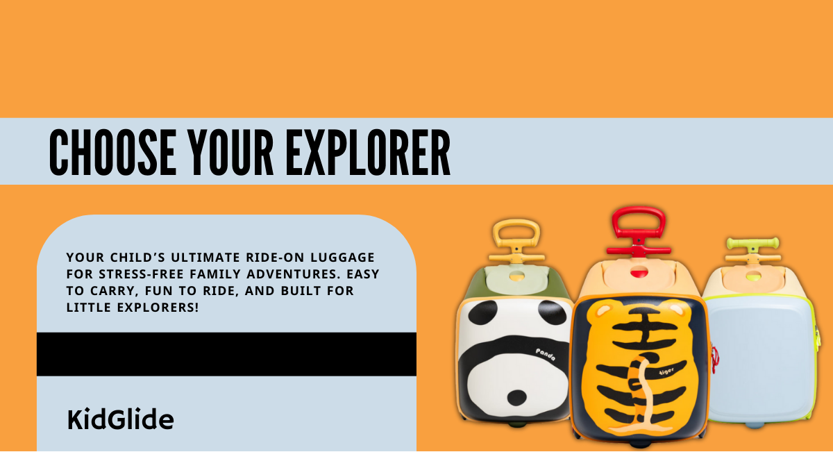 Make family trips easy and stress-free with KidGlide™! Lightweight, rideable, and available in Tiger, Panda, and Classic Blue, it keeps kids entertained while you travel. Durable, spacious, and designed for fun—travel has never been this enjoyable!